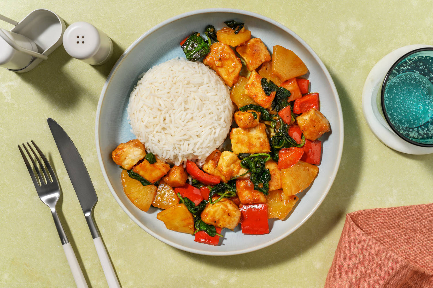 Indias mange spennende smaker og krydder er inspirasjonen bak denne retten. Vi lager en rask og enkel bowl med en base av luftig basmatiris som vi topper med vegetarstrimler stekt i en glaze av aprikoschutney og soyasaus. Som tilbehør slenger vi sammen en granateplesalat med fersk spinat, agurk, mynte og koriander. Sist, men ikke minst, så topper vi retten med en klatt mild yoghurt.