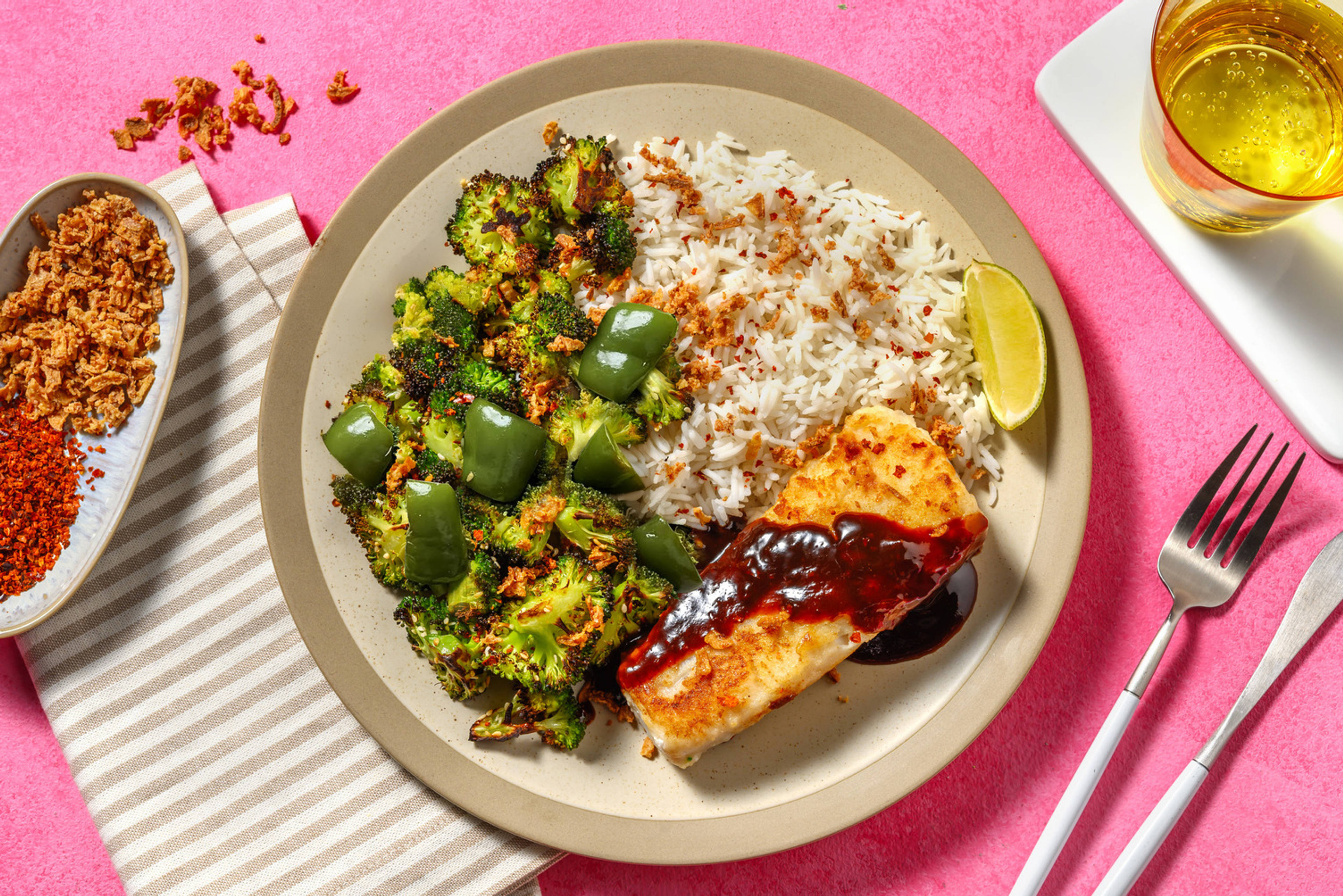 Anrett fisk og mangosalsa ved siden av riskuppelen.