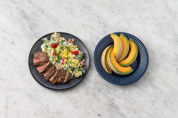 med potatissallad, senapsdressing, majs och nätmelon