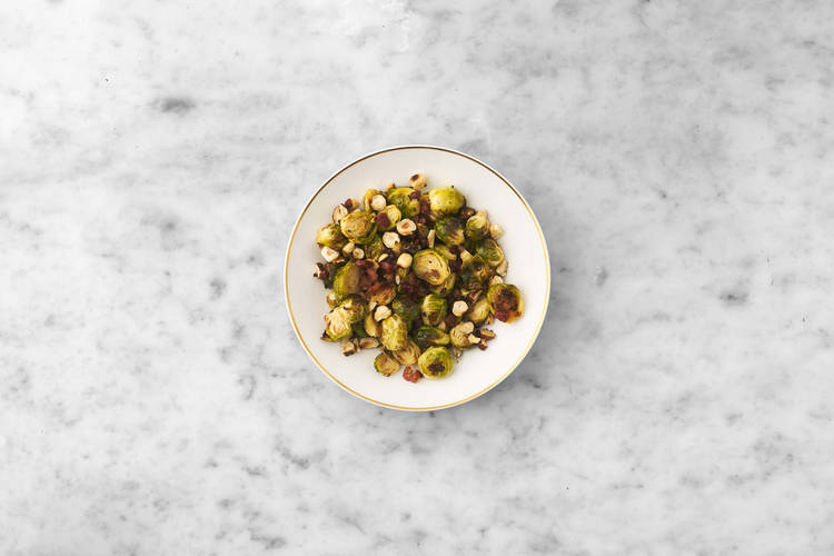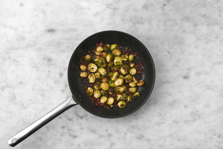 Stek bacon i samme stekepanne på middels høy varme i 4-5 min, eller til gyllent og sprøtt. Tilsett ovnsbakt rosenkål, honning og vann, og bland godt.