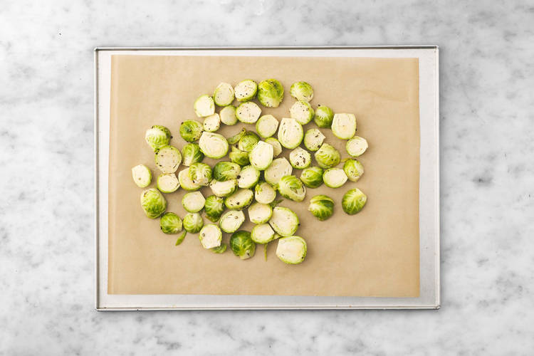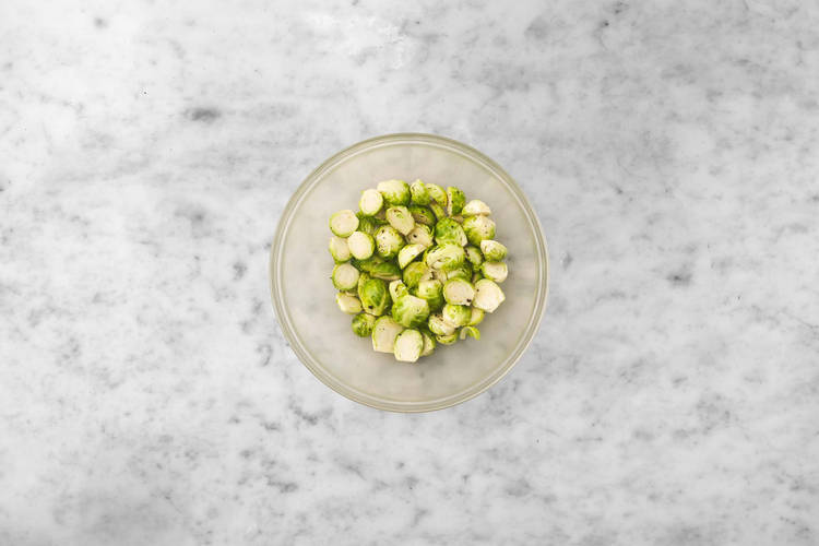 Fjern de ytterste bladene på rosenkålen og del dem i to.
