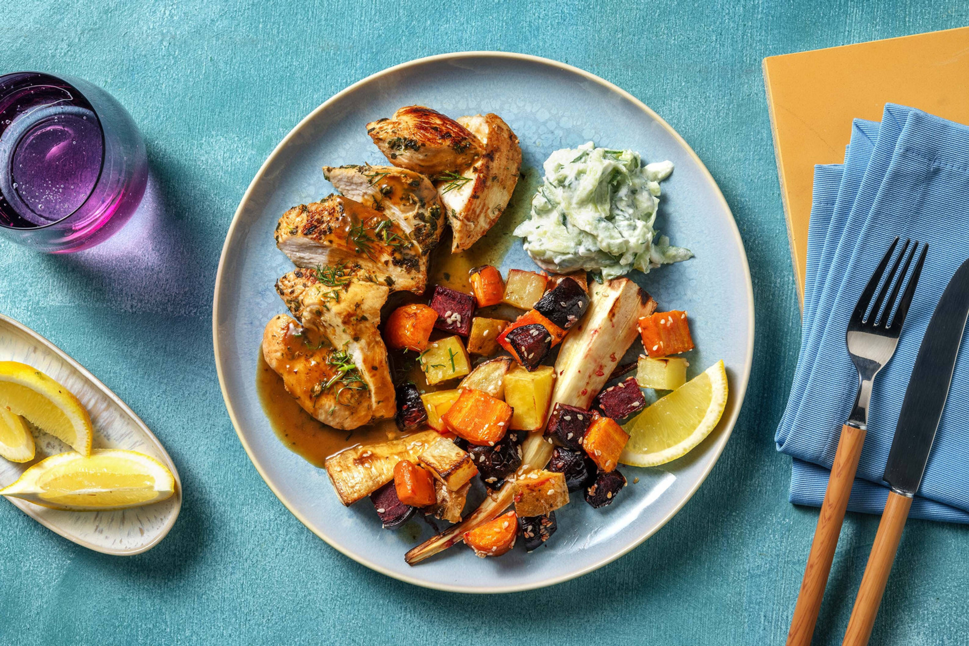 Topp med en klatt aprikoschutney og urteyoghurt.