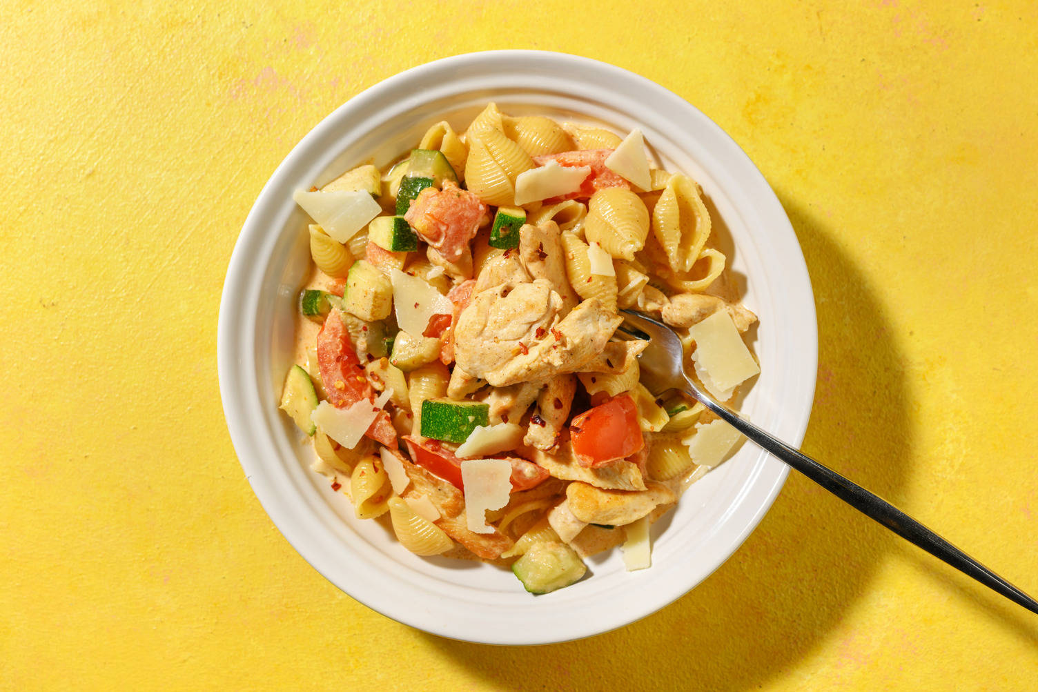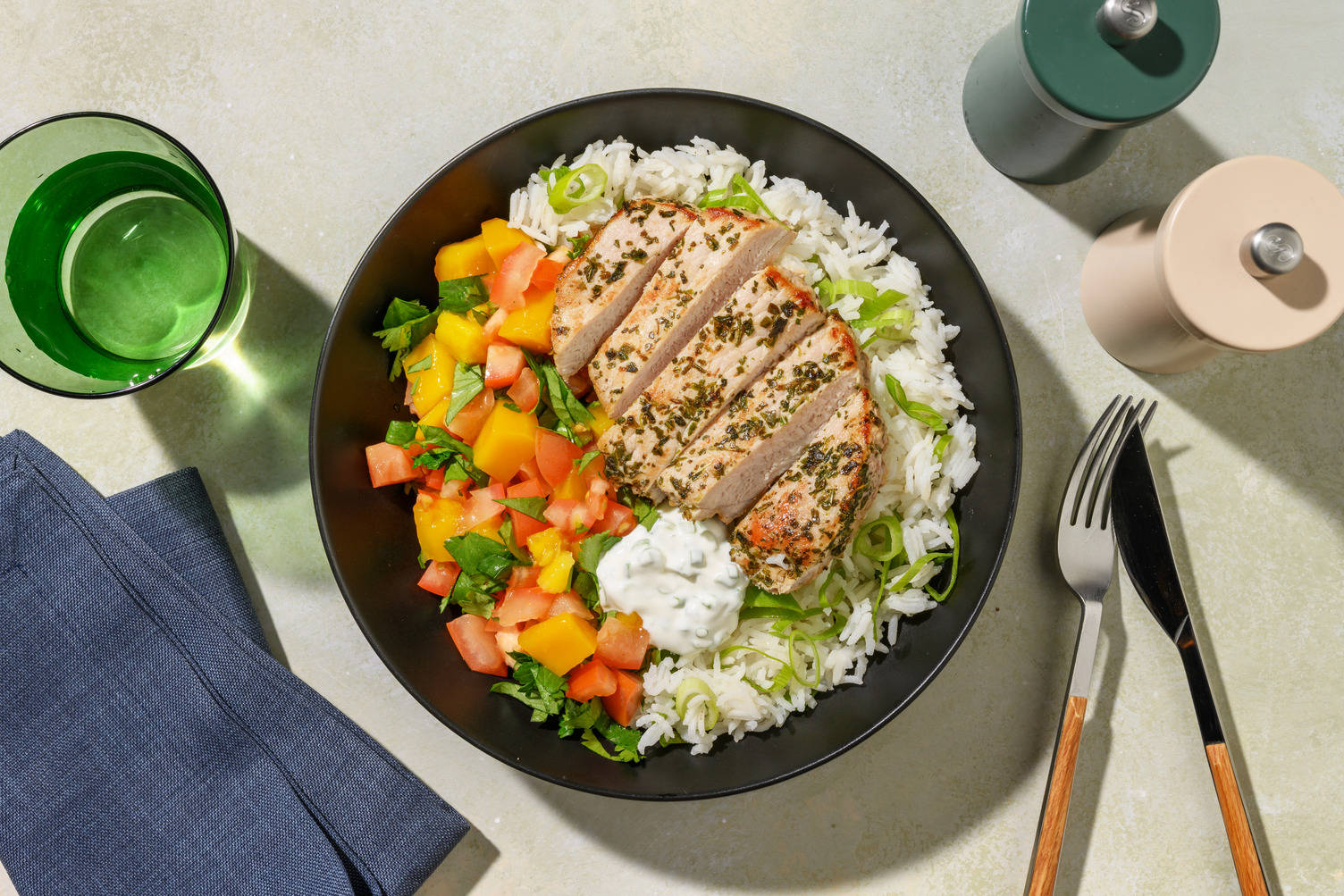 Bygg hver tortilla med kylling, grønnsaker, tomatsalsa og en klatt rømme.
