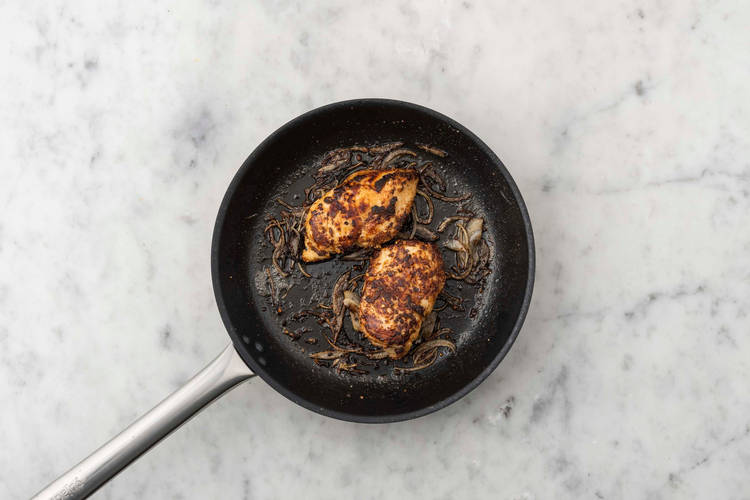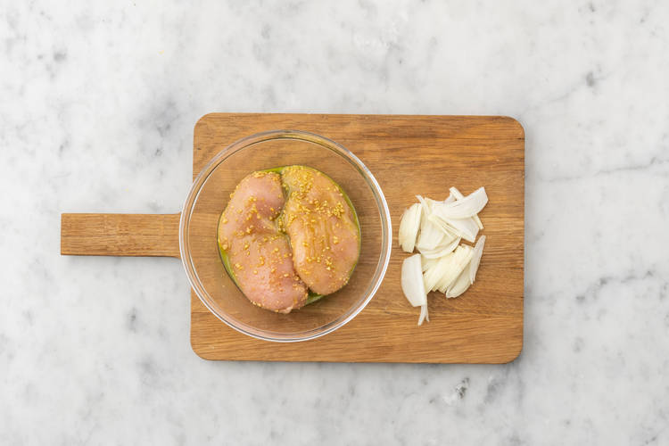 Opvarm en smule olivenolie i en stor stegepande på middelhøj varme.Steg kylling i 1-2 min på hver side.Tilsæt rødløg, og steg videre i 5 min, eller indtil kyllingen er gennemstegt og løgene er blød. VIGTIGT: Kyllingen er færdig, når kødet er hvidt og uden antydning af rødt.