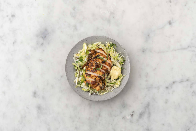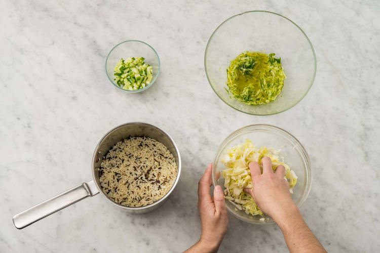 Bland mayonnaise og asiatisk dressing i en lille skål.Vend spidskål med et nip salt i en anden skål. Tilsæt ris, hakket agurk og agurkedressing, og rør godt rundt.