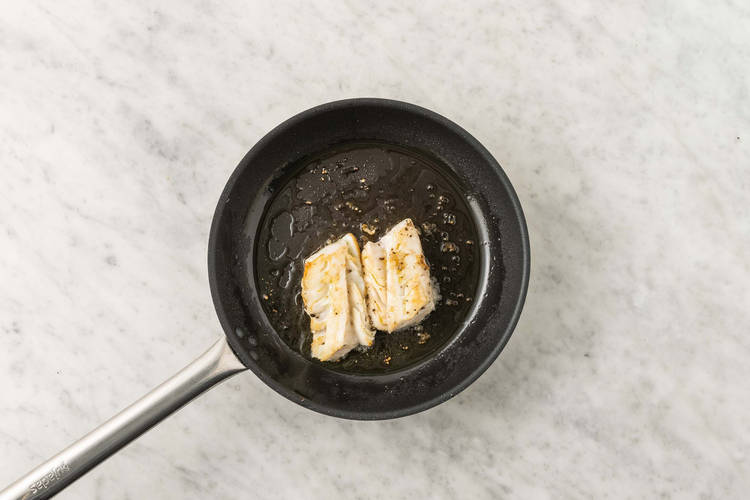 Varm opp en skvett olivenolje* i en stor stekepanne på middels høy varme. Klapp forsiktig fisken tørr med kjøkkenpapir og krydre med en klype salt* og pepper* på hver side. Stek fisk i 2-3 min på hver side. TIPS: Fisken er ferdig når kjøttet er melkehvitt og matt.