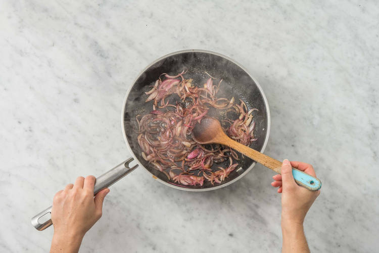 med karamelliserad rödlök och pommes