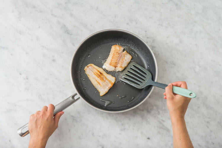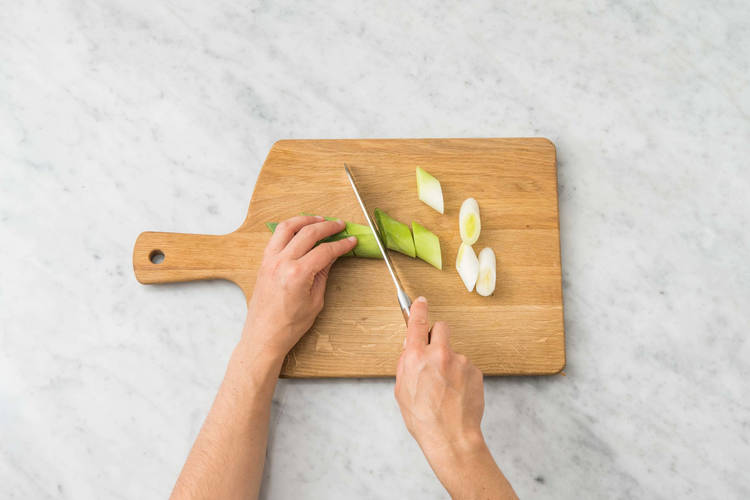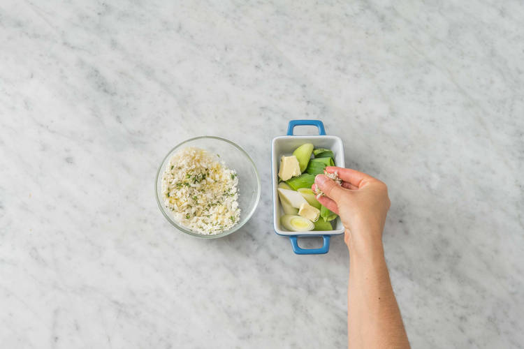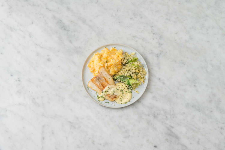 med pankotoppad purjolök, potatis- och morotsmos