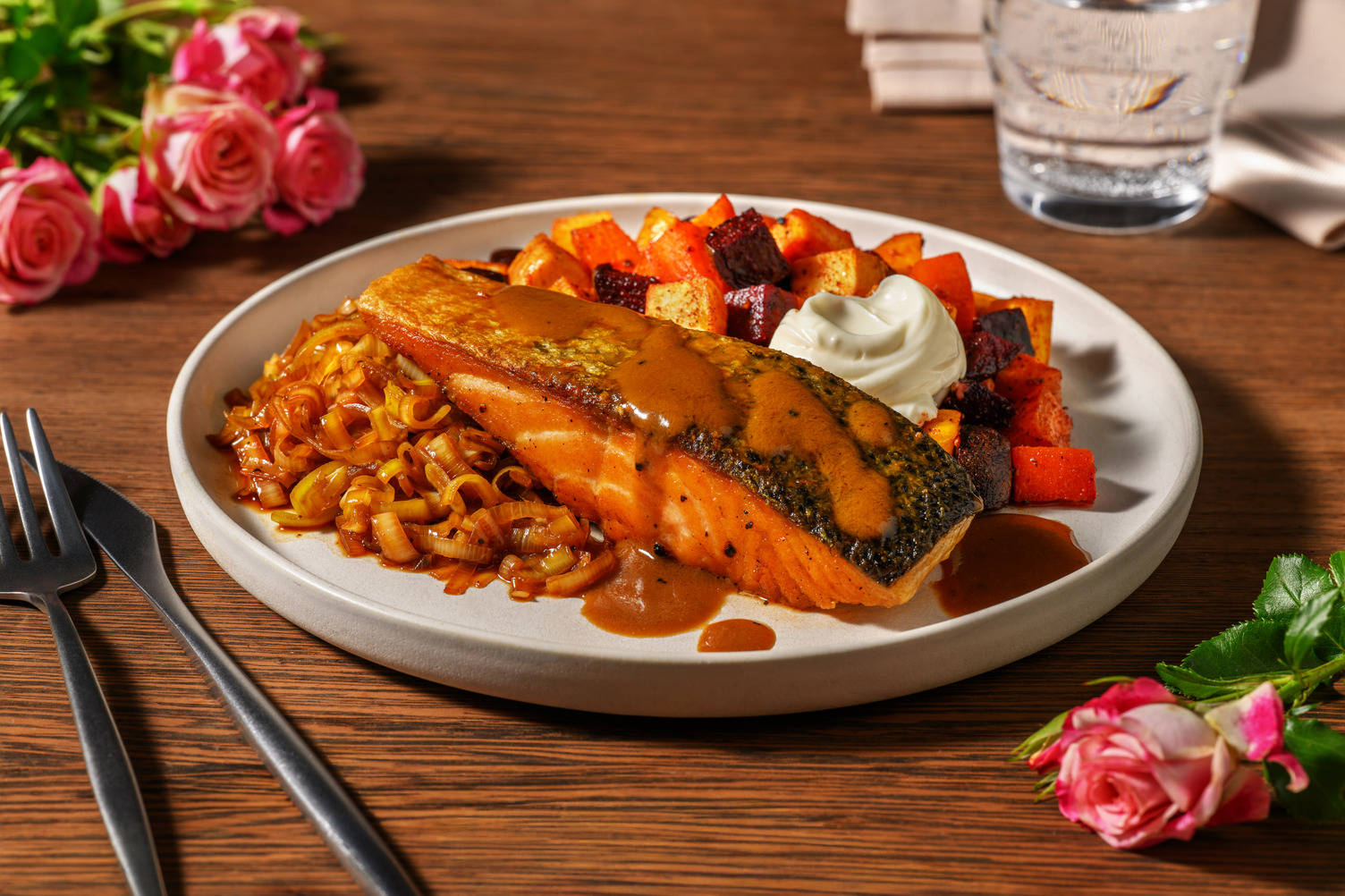 Vi skjønner godt at denne oppskriften fanget oppmerksomheten din, for stekt laks slår alltid an rundt middagsbordet! Disk opp med smørstekt laks servert med lune, ovnsbakte rotfrukter og en kremet agurk- og dillsalat, toppet med sitrusfruktsaft og et dryss sesamfrø. Enkelt, raskt og veldig godt!