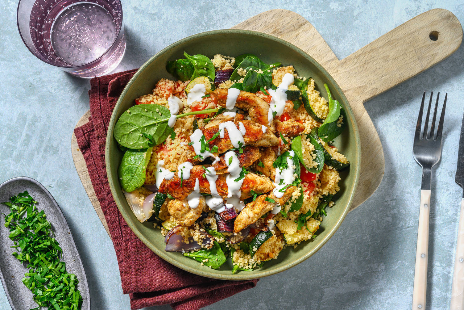 Oftest er couscousen du kjøper i butikkene ferdiglaget, noe som betyr at du bare trenger å tilsette en liten mengde vann, kraft eller buljongvann og la den koke i noen minutter til den har absorbert væsken så du kan gjøre den luftig med en gaffel. Tips: hvis du drypper couscousen med en liten mengde olivenolje hjelper det med å skille kornene.